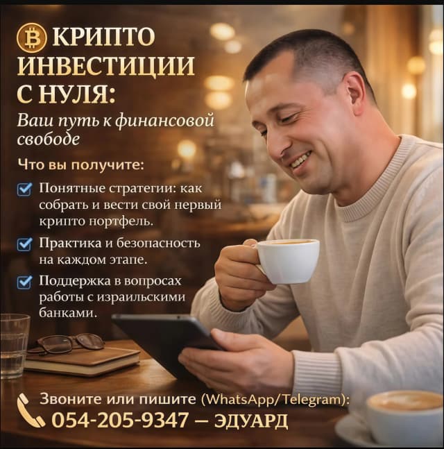 💰 КРИПТО ИНВЕСТИЦИИ С НУЛЯ: ВАШ ПУТЬ К ФИНАНСОВОЙ СВОБОДЕ Что вы получите: 🔹 Понятные стратегии: как собрать и вести свой первый крипто портфель. 🔹 Практика и безопасность на каждом этапе. 🔹 Поддержка в вопросах работы с израильскими банками. 📞 Звоните или пишите (WhatsApp/Telegram): 054-205-9347
